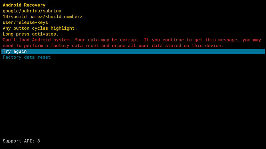 这意味着系统无法正常启动,进入了Recovery界面。先长按背面按钮3s,选定“try again”,如果依然不行,短按按钮跳转到“Factory data reset”,再长按按钮选择这一项。