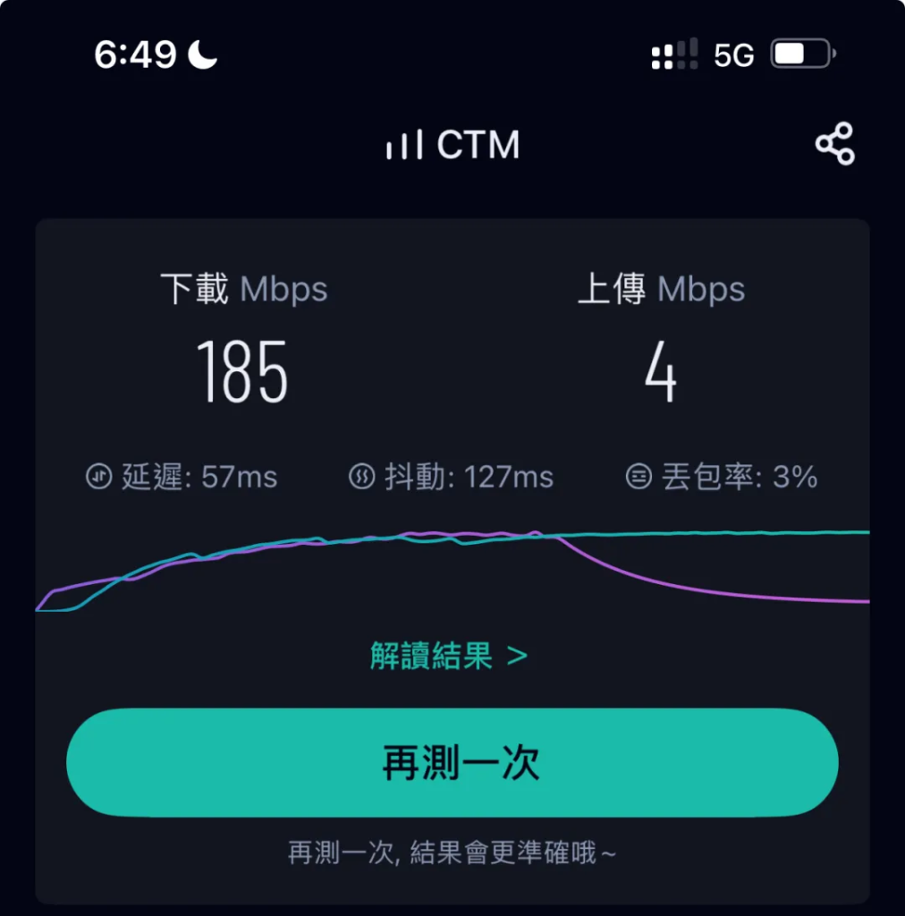 与4G网络相比,5G网络是一个更高级别的网络技术,它承诺更快的速度和更低的延迟。使用CTM手机卡,在深圳的某些地方,我成功连接到了5G网络。5G网络的下载速度在我个人测试中高达185Mbps,上传速度高达4Mbps。这种速度让我印象深刻。我可以轻松地下载大型文件,观看4K视频流,进行高质量的视频通话,以及进行任何需要高速数据传输的任务。5G网络的低延迟也使得在线游戏和实时视频流更加流畅。