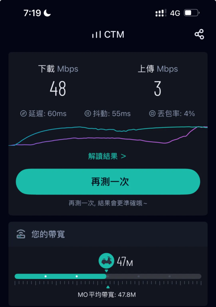 在深圳的某些地方,我连接到了CTM的4G网络。4G网络的下载速度在我个人测试中高达48Mbps,上传速度高达3Mbps。这对于大多数常规网络活动来说已经足够了。我可以流畅地浏览网页、使用社交媒体、发送和接收邮件,以及观看高清视频流。4G网络提供了稳定和可靠的连接,对于大多数用户来说,这已经足够满足日常需求。